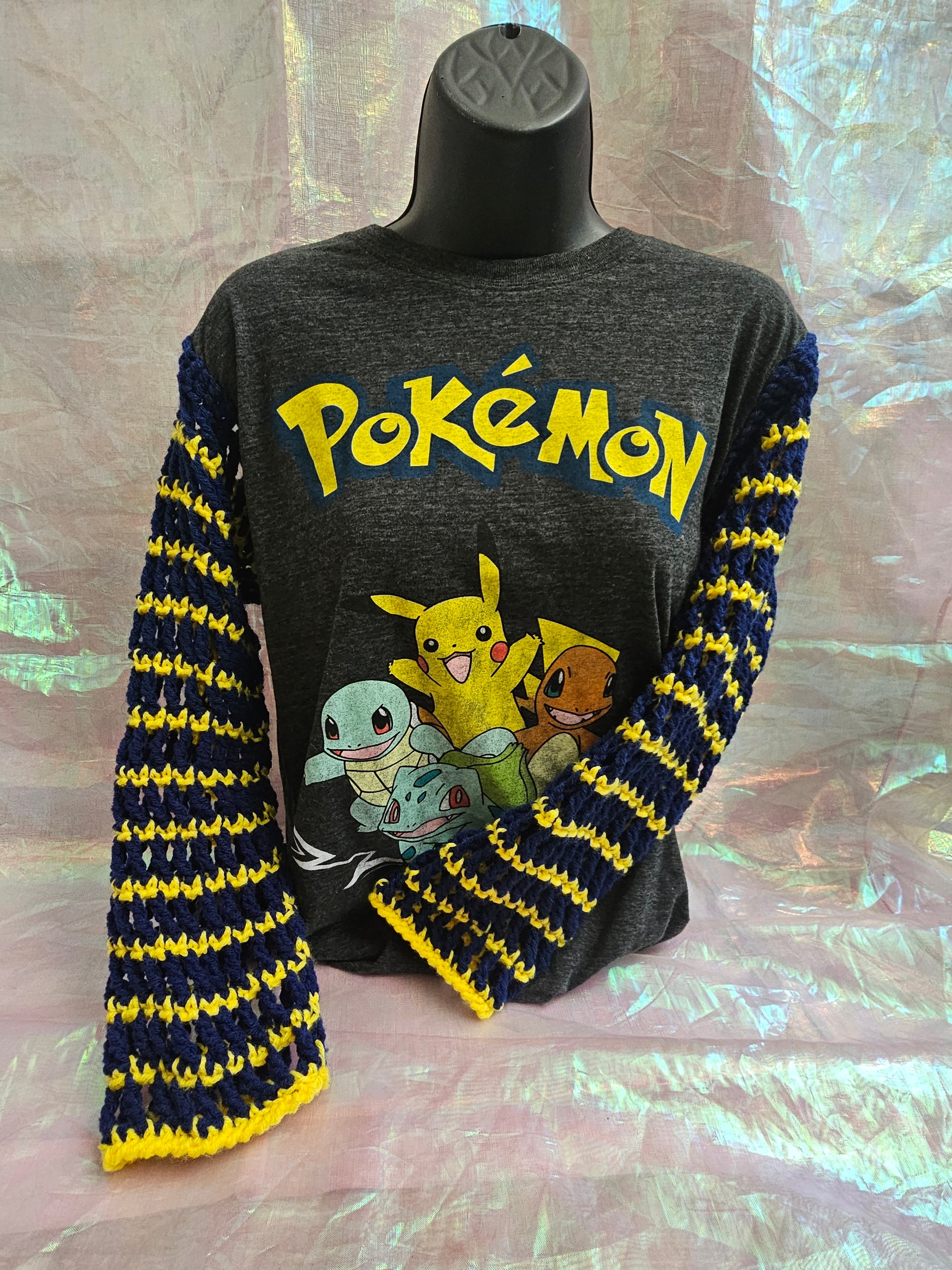 Upcycled pokémon Tshirt with crochet sleeves